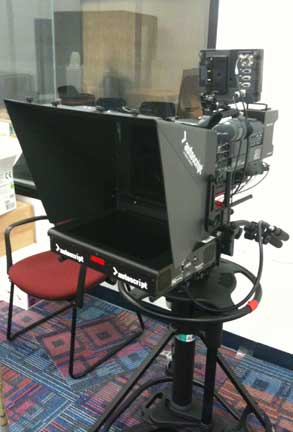 The room has five pods — tables, each with one hard drive and computer monitor. In the rear right corner is a sound booth. New additions to the room are this television camera and a wall-size world map that can work for standups.