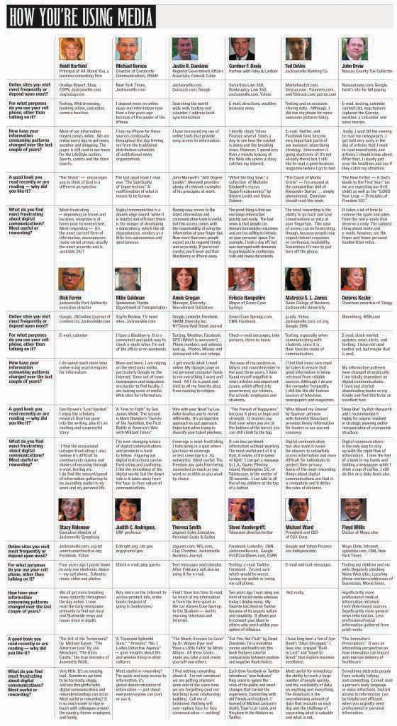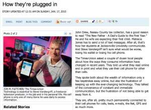The story that catches my interest is the feature on “How they’re plugged in,” a story about how they consume information and how that has changed in the last few years. The story includes a full page (in newspaper language) of profiles of 18 individuals and their technology use.