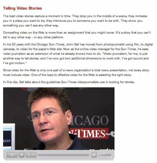 We were fortunate to identify and work with several video journalists (VJs) or videographers. We were able to include sample video stories in the course. With four video stories of July 4th celebrations, we could include information from each VJ about what was involved in getting that story — the time involved in shooting and editing, the equipment used,, etc. John Sall, a video journalist at the Chicago Sun-Times who trains new VJs, offered advice on different elements of shooting and editing.