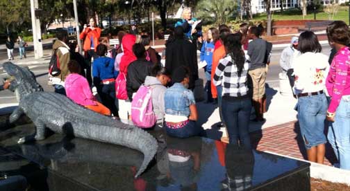 The Mad Hatter and Alice were on the UF campus to distribute large playing cards that were invitations to A Mad Hatter's Ball. (Photo with my iPhone)