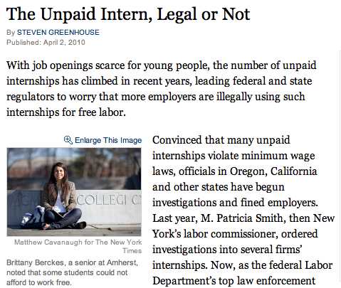 Her e-mail reminded me of an article I’d read last month in the New York Times — The Unpaid Intern, Legal or Not. The story was about the trend of businesses and organizations having student interns working for them, but many of those internships were unpaid. Federal regulators are investigating the legality of having college students working for no pay and if those unpaid college interns are putting potential employees out of work.