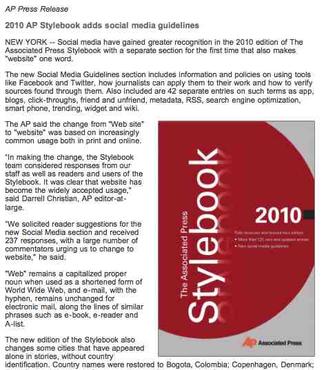 After reading about the 2010 AP Stylebook on Mashable: The Social Media Guide, I received an e-mail (and it still is e-mail in AP style) from one of the bookstores in town asking if I had a preference on which edition of the AP Stylebook was ordered for my course, Writing for Mass Communication.