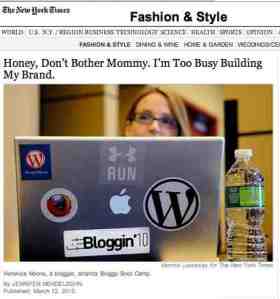 The New York Times created a lot of backlash last March with Jennifer Mendelsohn’s story “Honey, Don’t Bother Mommy. I’m Too Busy Building My Brand.” The story and headline presented a rather condescending view of mom bloggers as learning skills to use for their blogs — and perhaps ignoring their kids while blogging.