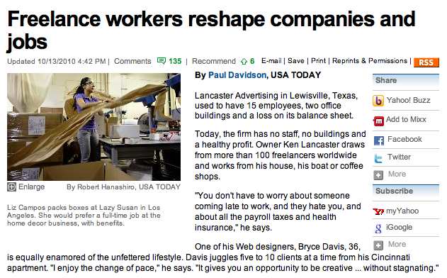 The USA Today story included several different businesses as examples of using fewer full-time employees and more freelancers — an advertising firm, a warehouse and a pharmaceutical company. At least two of the free-agent employees interviewed for the story said that they liked the challenge of working for a variety of employers and having a range of jobs so they aren’t “stagnating.” But it was clear that other freelancers interviewed for the story were working these temporary jobs because those were the jobs that were available.