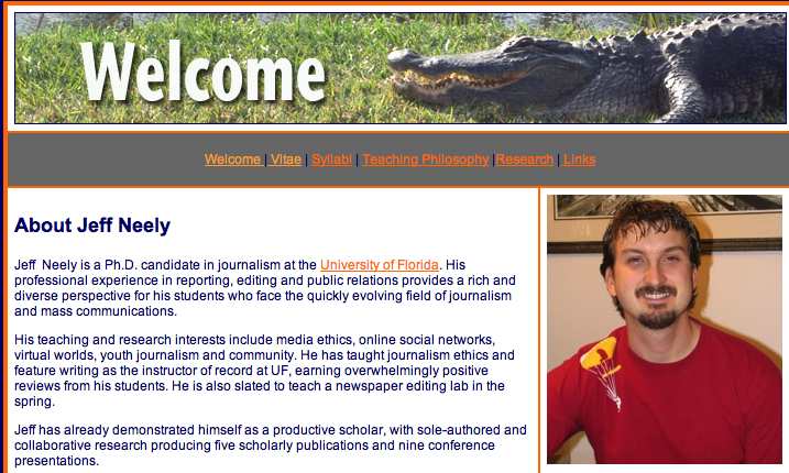 Jeff Neely, a Ph.D. candidate in the College of Journalism and Communications, recently accepted a faculty position at the University of North Carolina/Wilmington. He explained that in his new position, he will be “the journalism department,” as the journalism program is housed in an English/Speech/Communication department. One of his concerns was setting up a teaching schedule that was manageable. He will have a 3/3 load, meaning that he will teach three courses fall semester and three courses spring semester. But he will be teaching two sections of the same course each term, so he will have two preparations and not three. He already has his teaching assignment for Fall 2011 so he can be prepared.