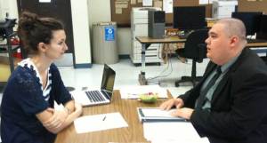 Andreea Savu interviews Advertising major Cary Palmer as part of the portfolio interview assignment. Cary was interested in interviewing for an internship with a radio station. iPhone photo by Julie Dodd