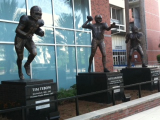 Bronze statues of the University of Florida's three Heisman Trophy winners are a popular attraction just outside The Swamp. The statues were unveiled at the 2011 Orange and Blue football game. From left to right: Tim Tebow, Steve Spurrier and Danny Wuerffel. Photo by Julie Dodd