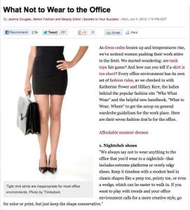 Yahoo! featured “What Not to Wear to the Office,” a blog post by Johanna Douglas, where she offered seven tips from Katherine Power and Hillary Kerr’s new handbook, “What to Wear, Where” for women employees.