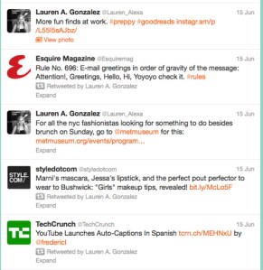 I asked Lauren Gonzalez (@Lauren_Alexa), a former students who is tech savvy, to offer tips on using Twitter. Lauren is an intern this summer with Laird+Partners, a creative agency in New York City specializing in strategic marketing. Last summer, Lauren was an online editorial with House Beautiful in NYC and used Twitter as part of her job, including live tweeting from a kitchen expo at Rockefeller Center. During her internship last summer, I asked her to write a guest post about how our class had helped prepare her for her House Beautiful internship. This time, I invited Lauren to write a guest post as a DT (direct tweet).
