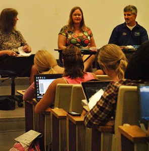 Some students were reading the interview questions on their phones and then taking notes in their notebooks. Students were referring to websites that were discussed during the interview. When Chip Skinner talked about TransLoc, the free app that lets riders track the buses in real time, several students got out their phones and downloaded the app in our wireless auditorium.